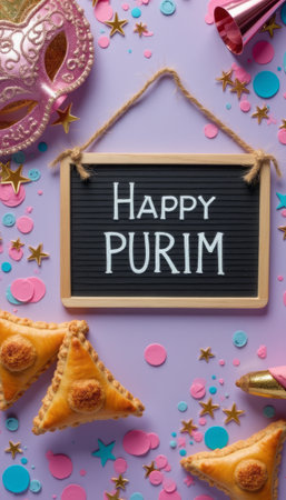 A vibrant flat lay captures the joyous spirit of Purim, featuring a chalkboard sign that reads Happy Purim surrounded by colorful confetti, a pink mask, and delicious hamantaschen pastries. The playful arrangement of festive elements, including stars and party hats, creates a lively atmosphere, inviting everyone to join in the celebration.