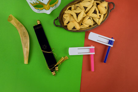Purim festival is Jewish religious festival celebrated with cookies shofar noisemaker tallite carnival masks and hamantaschens as symbols of celebration