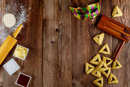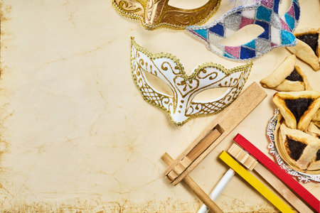 Purim Jewish holiday with hamantaschen cookies hamans ears, carnival mask and parchment