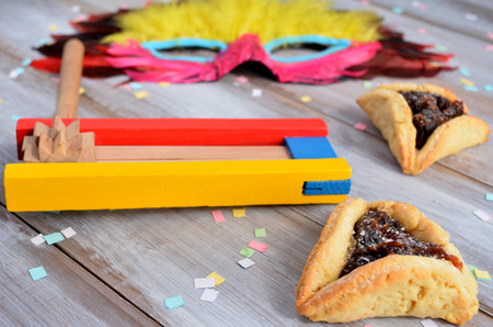 Hamans ears cookies noisemaker and mask for Purim celebration jewish holiday carnival