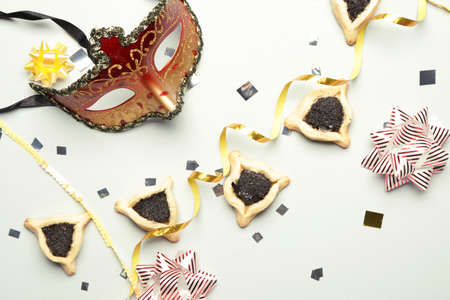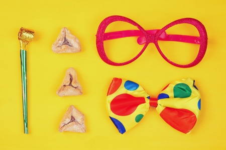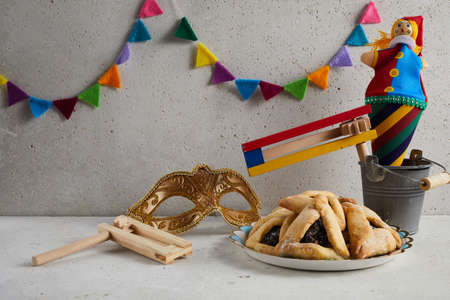 Jewish holiday of remembrance Purim tradition attributes symbols such as carnival mask, hamantaschen cookies to festival