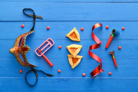 Purim celebration concept (jewish carnival holiday) over wooden blue background. Top view, flat lay