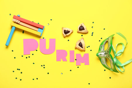 Composition with the word PURIM, Hamantaschen cookies, rattle and carnival mask on yellow background