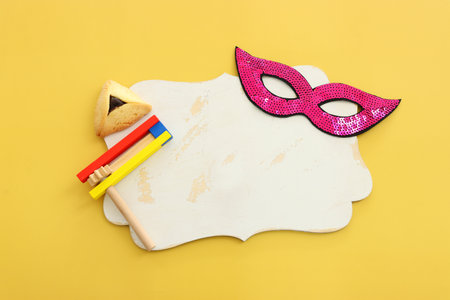 Purim celebration concept (jewish carnival holiday) on yellow background, top view, copy space. Purim flat lay.