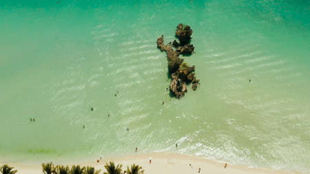 White Beach of Boracay and people swim at turquoise azure sea near Grotto Willys Rock upon which stands the Virgin Mary Statue. Copy space for text. Summer and travel vacation concept.