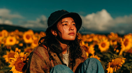 portrait of asian woman wearing a black bucket hat and blue jeans, sitting in the middle of a field of sunflowers.