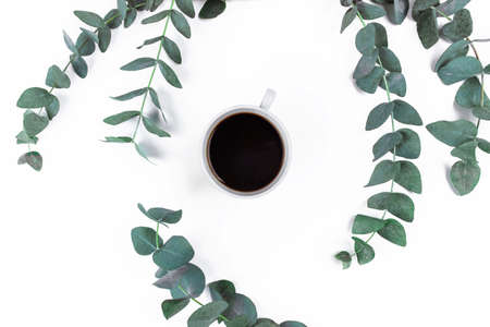 Isolated white background with a Cup of coffee surrounded by eucalyptus. Flat lay, top view.