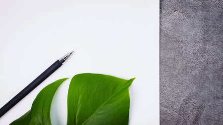 A large green leaf, pen and spiral notebook on a gray background. Copy space