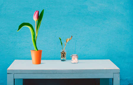 Scandinavian style. Interior Design. Large pink chrysanthemum in a long glass vase. Two cups of different size. Frame for photo. Empty space for text