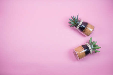 Two cacti on pink background, composition. Minimal abstract pink background composition with artificial flowers.