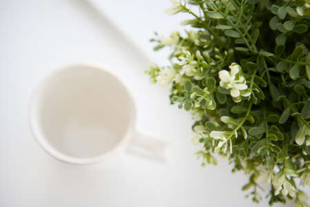 white cup near with a green plant on a light background in the morning light