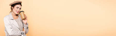 panoramic shot of stylish woman in autumn outfit holding coffee to go while looking at camera isolated on peach