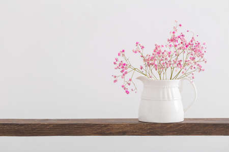 pink gypsophila in jug on wooden shelf on white background