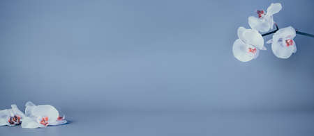 Beautiful floral background. White phalaenopsis orchids on a light blue background. Pastel colors. Tropical flower, branch of orchids. Wide banner mockup with copy space for text. Selective focus.