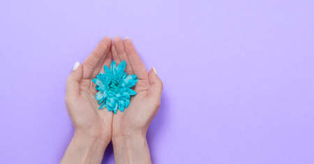Female hands hold white gypsophila flower on a blue background. Gentle composition with copyspace.