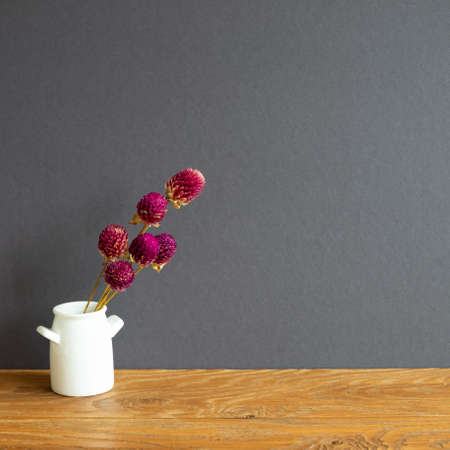Vase of purple globe amaranth flowers on wooden table. gray wall background. copy space