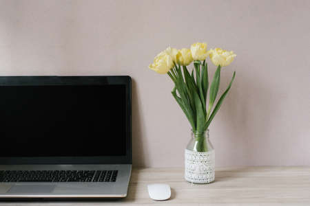 Spring home office still life composition. Blank laptop screen. Yellow tulips in a vase on the table. office workplace. Scandinavian interior.