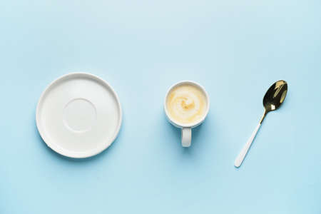 White small mug of coffee in a white cozy room in the morning.