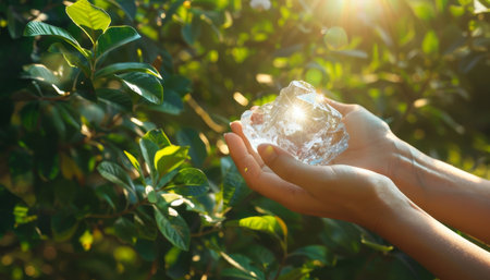 Hands holding crystal earth in sunny green environment celebrating nature and eco consciousness