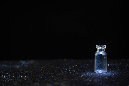 A little bottle put on the floor with all of glitter diamond dust on the floor on black background, have light shine on it like on stage