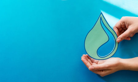 Woman hands holding paper cut water drop on blue background. Clean water and sanitation, saving water. World Water Day. Ecology concept.