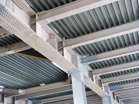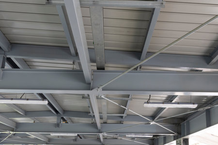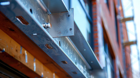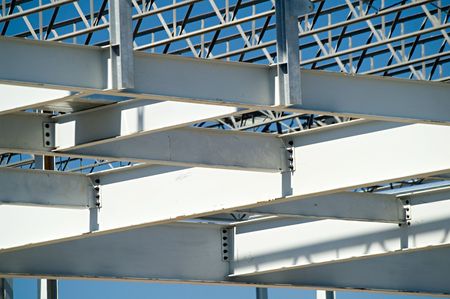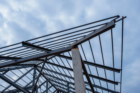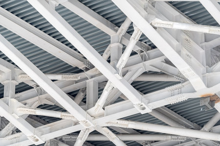 Close-up view of steel structural framework in construction, highlighting strength and design. Ideal for modern architecture themes and industrial projects.