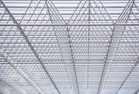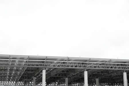 Row of stadium roof metal supports structure. Industrial steel background. No people.
