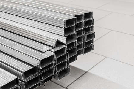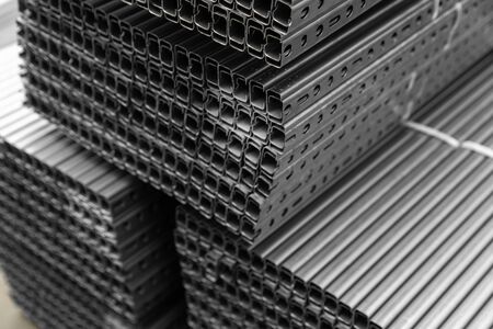 Aluminum industry extrusion at building construction site. Aluminum building system. Aluminum extrusion profile. Construction site storage with aluminum tubes. Steel extrusion. Industry material