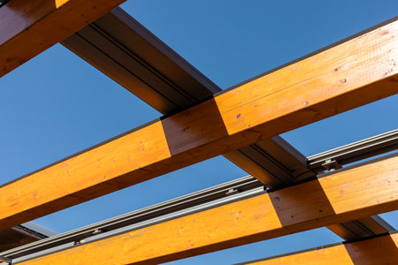 Closeup of wooden beams connected by metal braces in modern architectural ceiling structure, highlighting construction details.