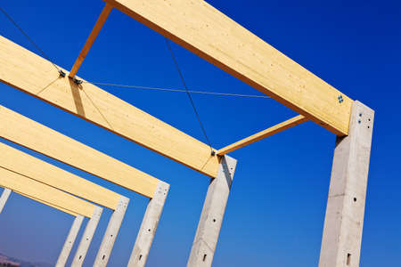 Modern wooden roof frame or frames, framework with trusses on a renovated house. Blue sky in the background