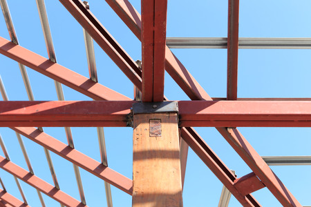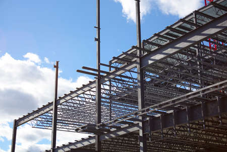 Steel frame workshop is under construction against a blue sky. New technology steel frame for construction