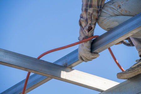 Asian male welder is welding steel beams in process of home renovation. Man worker working for building construction and structure.