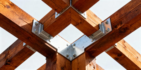 Modern timber construction detail showing steel connectors and bolts joining wooden beams for sustainable architectural support.