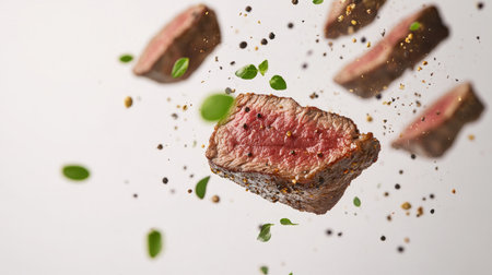 Discover a visually stunning image featuring juicy beef steak portions seasoned and floating with spices, perfect for culinary inspiration and gourmet presentations.