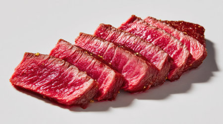 Discover vibrant, fresh slices of lean raw beef on a clean white background. Perfect for culinary ingredients, meal prep, and gourmet presentations.