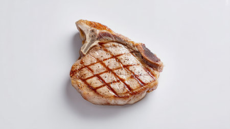 A beautifully grilled pork chop featuring tantalizing char marks on a minimalistic white plate, perfect for showcasing culinary skills and enticing food lovers.