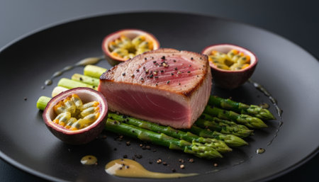 Seared tuna steak presenting on a dark plate, garnished with fresh green asparagus spears and vibrant halved passion fruit, symbolizing gourmet seafood dining and healthy cuisine