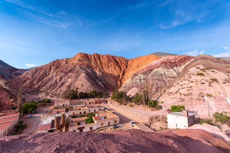 Cerro de los Siete Colores (The Hill of Seven Colors) behind Purmamarca village, in the colourful valley of Quebrada de Humahuaca in Jujuy Province, northern Argentina.