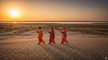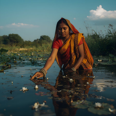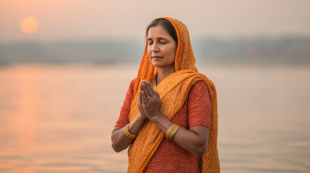 A serene moment of a woman in colorful traditional clothing praying by the river at sunrise. This image captures the essence of spirituality, peace, and devotion.
