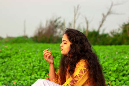 closeup side view of A beautiful Indian woman sitting with a leaf of a plant in her hand studying it