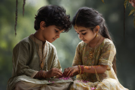 Siblings sharing joy and love during Raksha Bandhan festival celebration at home surrounded by a warm, festive atmosphere in the evening