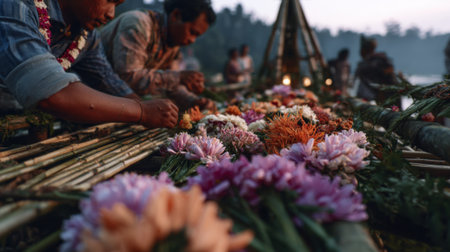 Medium shot of hands arranging vibrant flowers on wooden structures during early morning light at ceremonial grounds