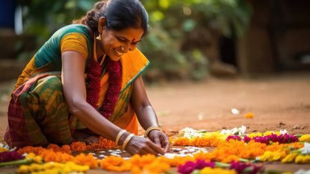 Beautiful Indian woman traditionally dressed making rangoli from flowers near the house in India