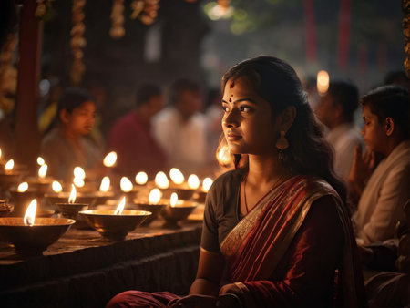 Devotees participate Aarti holding candles and offerings decorated temple Navaratri. serene atmosphere reflects reverence divine feminine energy.