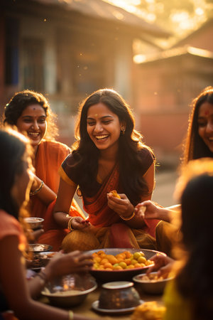 Teenage indian girls gathered around the festival food, celebrating Lohri