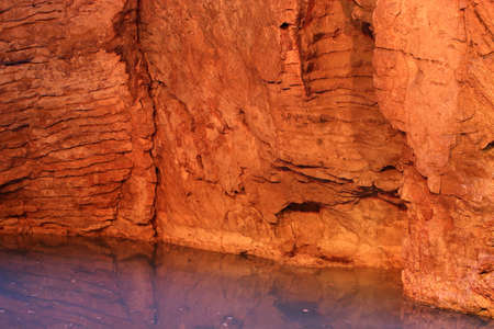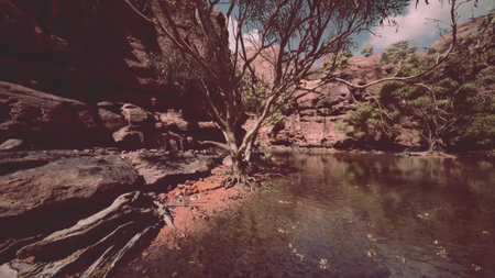 Red cliffs reflected in a permanent waterhole. Ellery Creek Big Hole is one of most popular camping, walking, swimming spots in West MacDonnell Ranges, Northern Territory on Larapinta Trail, Australia