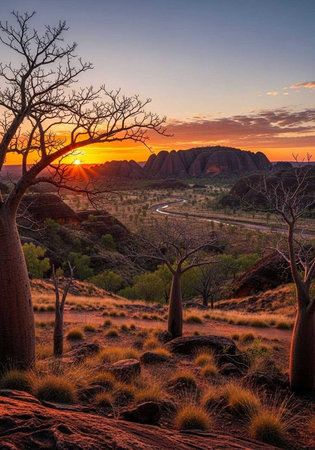 A serene desert landscape at sunset with baobab trees and a winding road