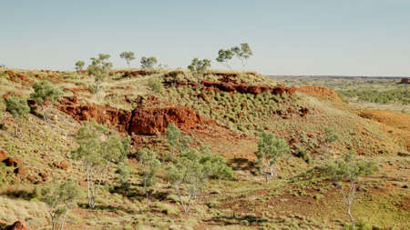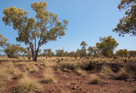 Australian outback with gum trees, ant hills and red soil
