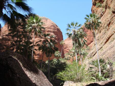 Palm fringed gorge in the Bungle Bungle ranges, Purnululu National Park, Kimberleys, Western Australia.