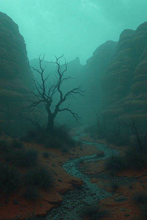 Fantasy landscape in the desert with a dead tree and a stream